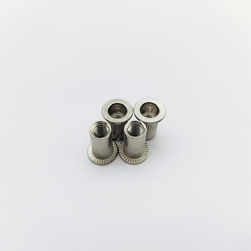 Frutos secos de remaches anti-rotación con cabeza plana y rizado vertical. Acero inoxidable 304, cuerpo semi-listo, hilos internos parciales. Tamaños M4-M8.